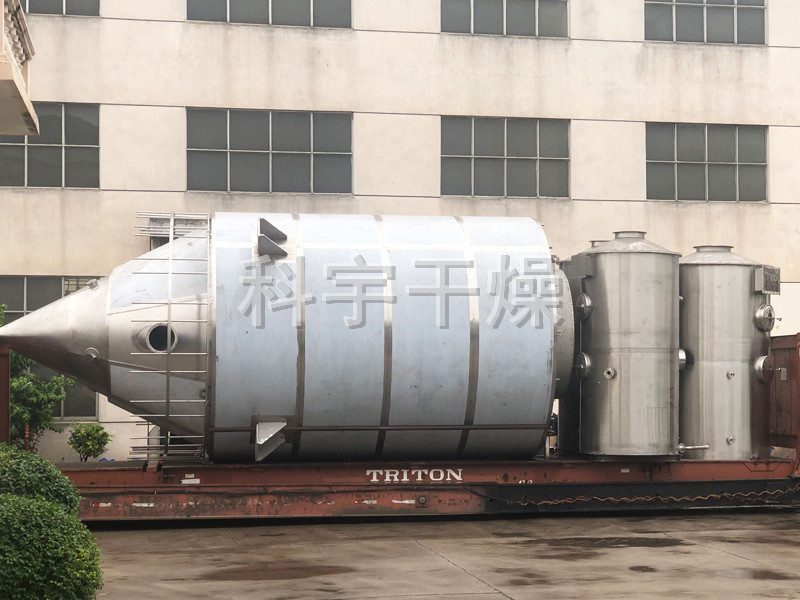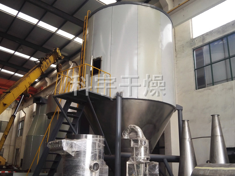 空氣經(jīng)過(guò)濾和加熱,進(jìn)入干燥器頂部空氣分配器,熱空氣呈螺旋狀均勻地進(jìn)入干燥室。料液經(jīng)塔體頂部的高速離心霧化器,(旋轉)噴霧成極細微的霧狀液珠,與熱空氣并流接觸在極短的時(shí)間內可干燥為成品。成品連續地由干燥塔底部和旋風(fēng)分離器中輸出,廢氣由風(fēng)機排空。