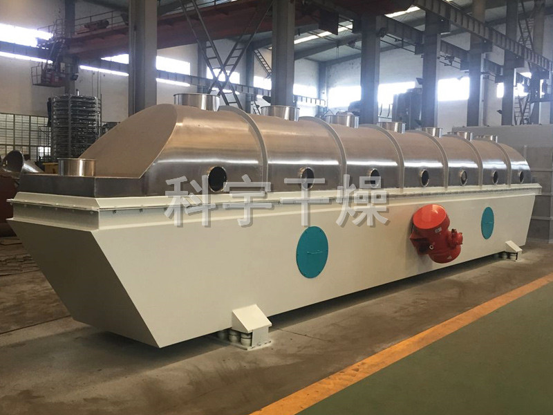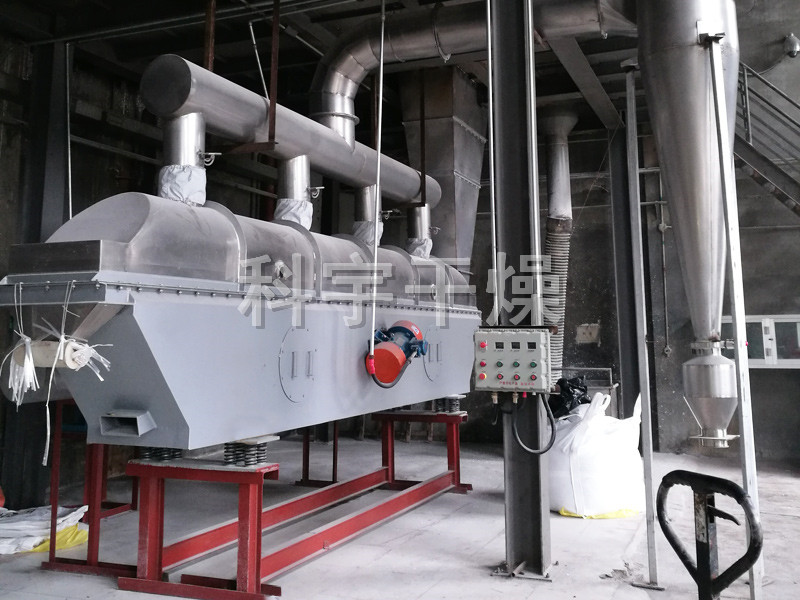物料自進(jìn)料進(jìn)口進(jìn)入機內,在振動(dòng)力作用下,物料沿水平面流化床拋擲,向前連續運動(dòng),熱風(fēng)向上穿過(guò)流化床同濕物料換熱后,濕空氣經(jīng)旋風(fēng)分離器除塵后由排風(fēng)1:3排出,干燥物料由排料進(jìn)口排出。