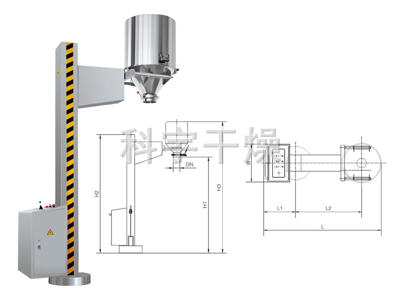 ??TJG 系列固定提升加料機由兩部分組成,即提升機及底座。提升機由機架、液壓提升系統及料門(mén)翻轉機構組成。工作時(shí),先將提升機的料門(mén)與料桶扣合,啟動(dòng)提升操作桿,料門(mén)與料桶一起上升,啟動(dòng)翻轉操作桿,料桶即可番轉180度,呈底桶向上姿態(tài)并移動(dòng)到所需位置,利用料門(mén)上出料蝶閥,可很容易將物料加入所需的工藝設備中。